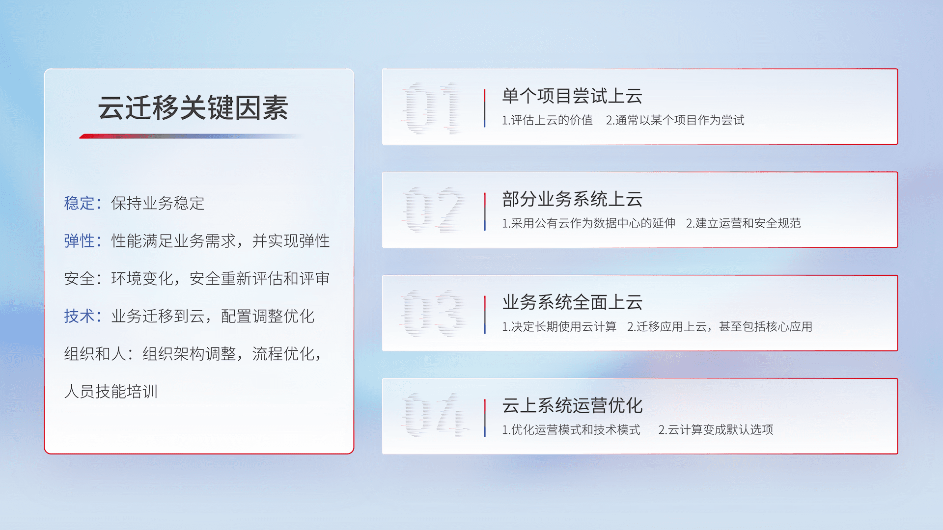 结合实际业务,,,,从规划设计、、云平台选型、、、云原生改造、、、、数据迁移、、、集成交付,,,,迁移全过程为客户识别最佳上云路径,,做好风险识别管理,,,设计网络架构、、身份权限、、、安全审计合规、、、操作审计、、、、日志审计、、监控告警策略、、、、多站点容灾设计等,,,对云上基础设施进行整体规划,,,,提升IT治理水平,,,以满足弹性、、、高可用、、、、高性能的需求。。。