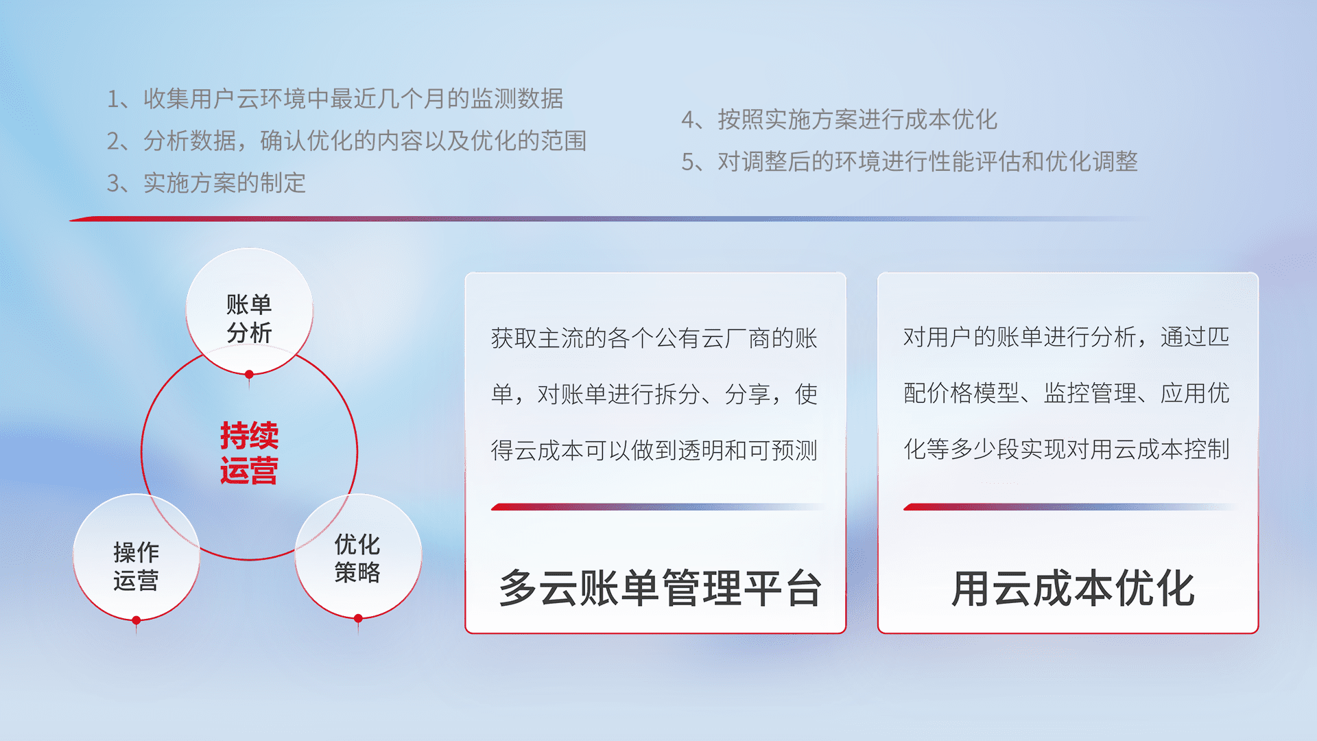 通过多云纳管,,,以统一的资源数据模型把客户的云资源进行抽象和封装,,,,进而实现对多云资源的统一操作,,,保障云资源管理的可靠性、、、、稳定性与可用性。。量身定制化运维内容,,,配置、、开发运维、、、、补丁管理、、、备份、、、、监控、、、认证和访问管理、、、审计和日常巡检等,,保障在用云过程中的可靠度,,,,稳定度以及高可用率。。。。